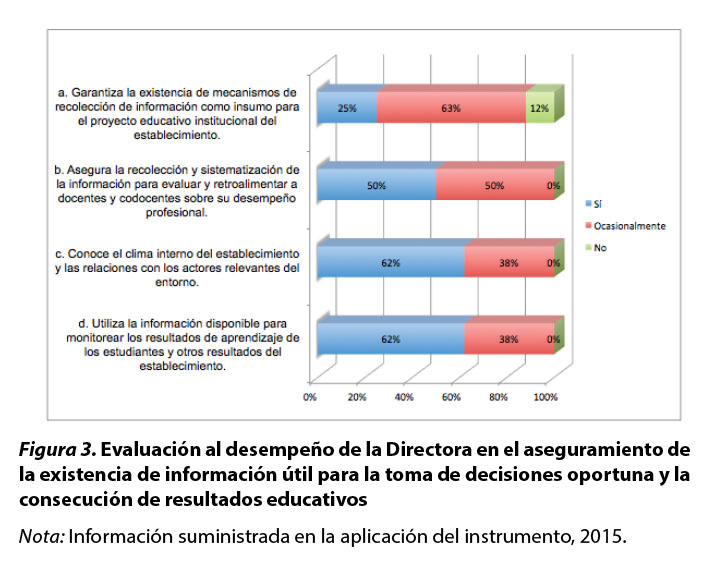 Respecto a la gestión de información útil para la toma de decisiones, el equipo de profesionales expresa una evaluación menos positiva del desempeño directivo. En la Figura 3 se detalla que solo un 25% considera que la directora garantizaría la existencia de mecanismo de recolección de información para nutrir el proyecto educativo institucional de la escuela, así como para evaluar o retroalimentar al equipo pedagógico sobre su desempeño profesional. Otro aspecto a mejorar es el uso de la información disponible para monitorear los procesos y resultados del centro escolar.