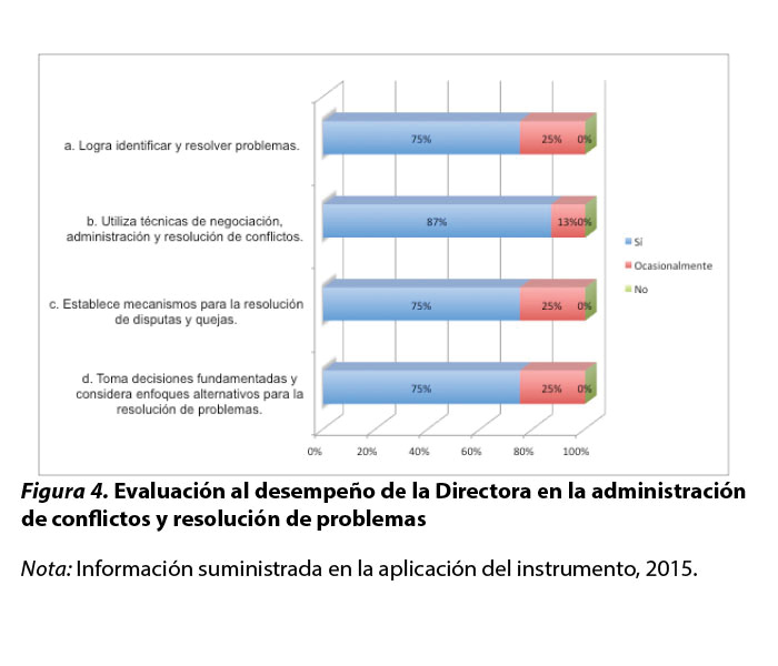 Otro de los criterios asociados al liderazgo, es la administración y resolución de problemas. En este aspecto, y tal como se presenta en la Figura 4, la evaluación del equipo de profesionales es más positiva que en el criterio anterior. Sin embargo, de igual forma se plantean desafíos, tanto para identificar, resolver y tomar decisiones fundamentadas que permitan la resolución oportuna y efectiva de conflictos al interior de la escuela. El desempeño directivo en este ámbito es relevante para el centro educativo porque las “adversidades y malentendidos que no son abordados en su debido momento pueden dificultar el logro de las metas” (Ministerio de Educación, 2005, p. 15).