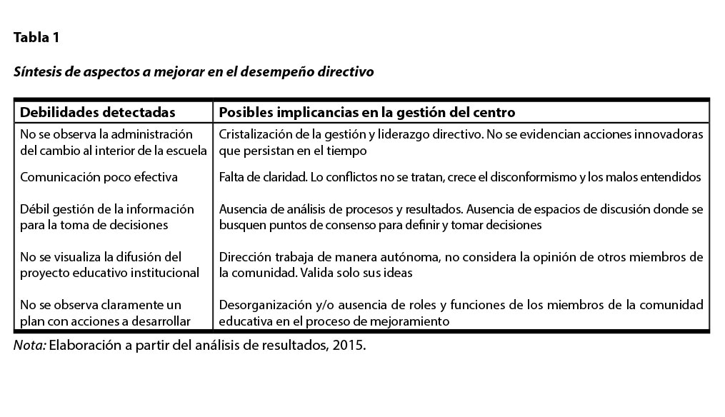 Con base en la reflexión realizada por la directora sobre los resultados de la evaluación ascendente, se asume que esta no estaría difundiendo, a través de su práctica directiva, el proyecto educativo institucional, teniendo que revisar el sentido que le otorga a la participación de la comunidad educativa. Se acuerda la elaboración de un plan de acción de la dirección que promueva reales cambios y mejoras al interior del centro educativo, basados en las debilidades de desempeño identificadas (ver Tabla 1).