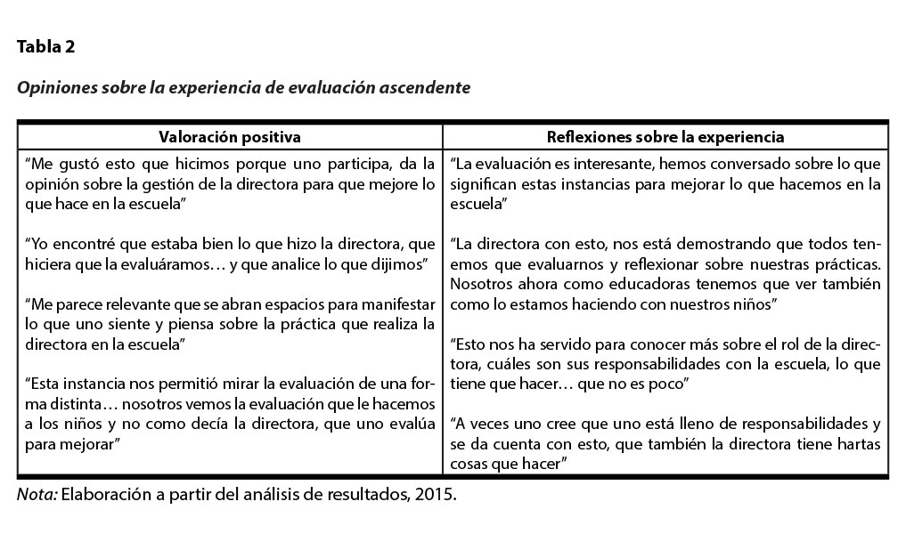 Por otra parte, se ha destacado la experiencia vivida por el equipo de profesionales de la educación, que valoran el proceso desarrollado por la directora, porque consideró su opinión no solo para medir el nivel de desempeño, sino que para abrir espacios de discusión sobre la gestión y el liderazgo directivo. La evaluación ascendente ayuda a la mejora en cuanto recoge las valoraciones desde una perspectiva diferente a la que estamos acostumbrados y cobra sentido en las organizaciones educativas, toda vez que se espera desarrollar prácticas de liderazgo más distribuido y colaborativo. La evaluación, en este contexto, rompe esa creencia arraigada en la sociedad, donde la valoración del trabajo de otros deben hacerla los expertos o las personas responsables de dirigir la institución.