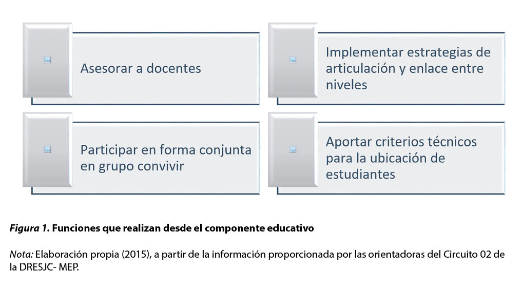 Tal como se aprecia en la figura anterior, las orientadoras participantes en el estudio mencionan las funciones que según el componente educativo deben realizar; lo interesante es que estas cuatro funciones representan las más significativas o de mayor peso, en contraste con otras tantas que están presentes en este componente, como lo son la implementación de estrategias que promueven la permanencia y el éxito escolar, tan señalado por el Estado de la Educación y el Consejo Superior de Educación, en su política del Centro Educativo de Calidad. Además, según ese componente educativo, deben realizarse talleres para promover el éxito escolar, como los talleres de técnicas de estudio y estilos de aprendizaje, entre otros.