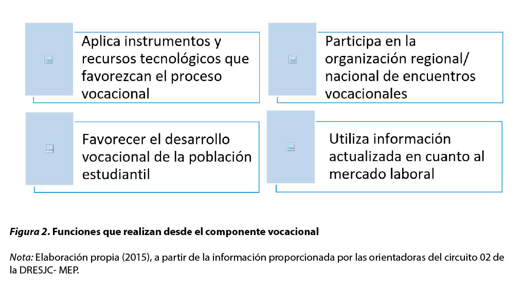 Sobre las funciones que desempeñan desde el componente vocacional, hay una total coincidencia entre los directores y el personal en Orientación, siendo que lo vocacional, como se ha mencionado, es uno de los elementos más visibles en cuanto a las funciones del personal en esta área, dado que, desde la caracterización de la clase, según lo establecido en el decreto ejecutivo 25592 MP, se encuentra el apoyar en el campo docente, así como formar y educar a los estudiantes en los campos de la orientación personal, social, educativa y vocacional.