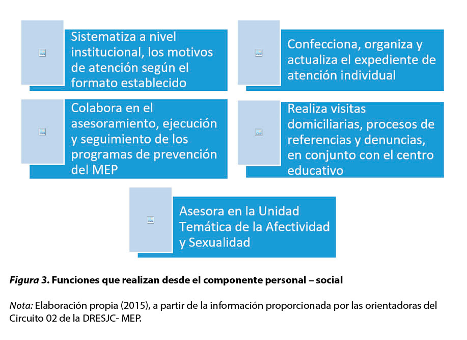 En la figura 3 se muestran las principales funciones que les corresponde realizar a las orientadoras participantes en el estudio, las cuales ciertamente conocen y describen dentro de este componente personal–social. Sin embargo, en sus respuestas, dejan entreabierta la interpretación de sí efectivamente las realizan según lo señalado, a la vez que manifiestan ciertas limitaciones para poder llevarlas a cabo.