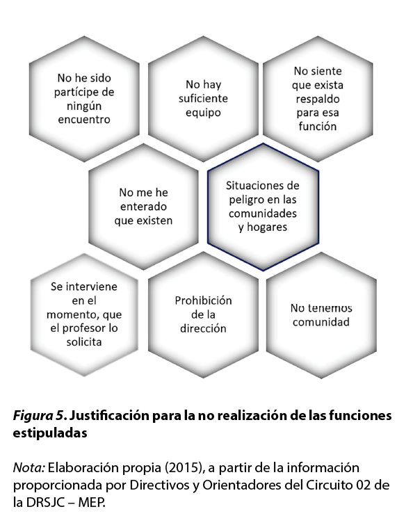 Tal como se desprende de las respuestas dadas en la figura 5, los profesionales en Orientación lo justifican desde el desconocimiento de la función que les corresponde realizar, así como, “la no capacitación o participación en esos tipos de actividades por la inexistencia de la convocatoria oficial, junto al desconocimiento de un respaldo legal para el cumplimiento de lo estipulado dentro de los lineamientos; otro aspecto señalado es la falta de un equipo tecnológico que agilice su labor”. Un elemento que llama la atención es “la condición de inseguridad de determinada comunidad”, en donde las entrevistadas reconocen cierta resistencia a realizar las visitas a los hogares, ya que estos se ubican en barrios con ciertas condiciones de inseguridad y violencia.