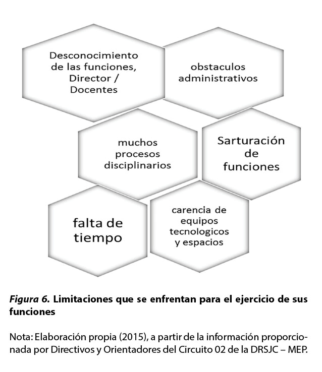 En relación con lo anterior, y en lo representado en la figura 6, el personal profesional participante expresa: “hay mucha permisividad de la parte administrativa para que hagamos otras funciones”. (Orientadora 12). También lo señala la orientadora cinco, cuando se planea realizar actividades relacionadas con sus funciones; ella indica: “la existencia de obstáculos administrativos para la realización de proyectos”. La orientadora seis, sobre el conocimiento de parte de los directores de las funciones que deben realizar, indica: “los directores no tienen a veces claridad ´qué es orientación”. Aunado a lo expresado por la orientadora siete: “hay desconocimiento de las funciones por el director”; por lo que algunas profesionales optan por realizar aquellas labores que son más administrativas que técnicas, o prefieren, por las instrucciones del superior, realizar aquellas que se le indican, para mantener cierta armonía con la jefatura, evitando los posibles conflictos por la no colaboración con lo solicitado.