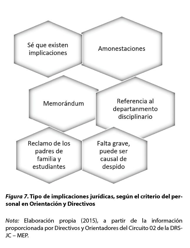 Dentro de lo expresado por el personal de Orientación y directivos, los primeros manifiestan conocer que sí existen implicaciones, pero no lo pueden puntualizar con claridad. La orientadora seis manifiesta: “supongo amonestaciones”. La orientadora nueve es más realista y señala que: “sé que ante el incumplimiento, hay una consecuencia que atender”; en lo que coincide la orientadora 12: “si no hago lo que tengo que hacer, voy a tener implicaciones”. Si bien, manifiestan que conocen las implicaciones jurídicas pero no las especifican, ni las describen con detalle, dejando esa sensación de que sí conozco pero no me adentro, o no quiero pasar por eso. Por su parte, los directivos sí fueron más enfáticos en señalar, en forma unánime, que la implicación sería una “amonestación”, pero tampoco lo especifican o desarrollan, aduciendo que eso le corresponde al Departamento Disciplinario de la Dirección de Recursos Humanos. Solamente la directora seis indica otro tipo de implicación: “Reclamo de los padres de familia y estudiantes”, en alusión al incumplimiento de alguna labor que les corresponde a los profesionales en orientación.