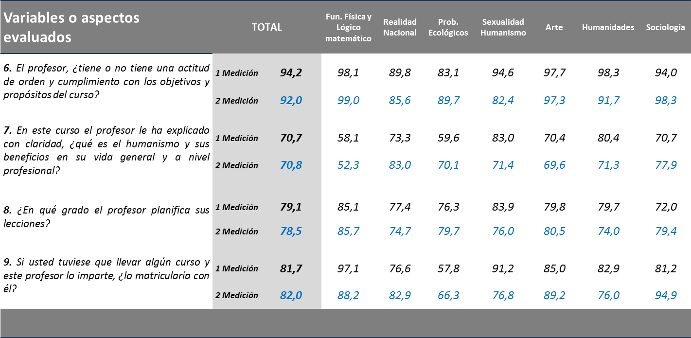 Es interesante analizar la variable #7. Esta se mantiene en 70.7 y 70.8, respectivamente. Se presentan algunas variaciones, según las secciones de la Escuela, pero en general la medida es constante. Este es un caso, entre otros, en el cual el análisis debe generar una señal de advertencia, no solo es necesario detener la caída del indicador global del factor, sino que hay que trabajar de forma intensa en mejorar el indicador de esta variable. Lo anterior porque el humanismo, y sus beneficios en lo personal y profesional, es básicamente la razón por la que existe la Escuela de Estudios Generales.