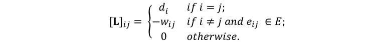 In [10], di represents the degree of the vertex vi. The degree of a vertex vi∈V is equal to the total weight of the edges connected to that node [11]. Using the degree of the nodes, the degree matrix, denoted as D, can then be built. The matrix D is defined as the matrix with the degrees di in the main diagonal.