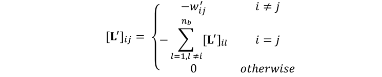 , PL,i, and QL,i represent the maximum active and reactive power generated and consumed at bus i, respectively. The sets ρ and σ represent a type of weight given to each node in the graph G. The elements wijϵ w,i,j=1,2,...,nb, represent the weight factor associated with each edge eij ϵ E. The weighted adjacency matrix W is created by computing the average power flow [3] between nodes i and j, where, Pij and Pji are the active power-flow from bus i to bus j and from bus j to bus i, respectively.