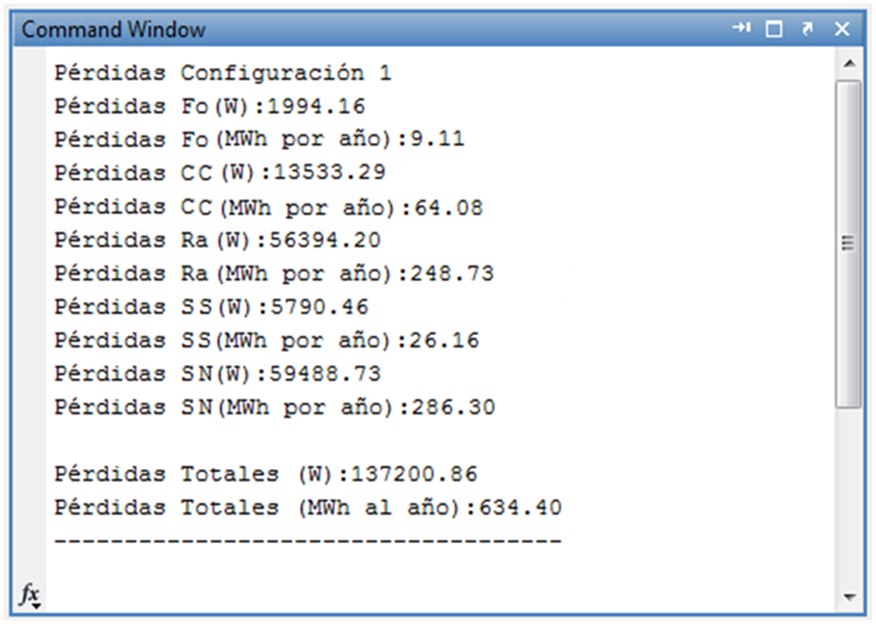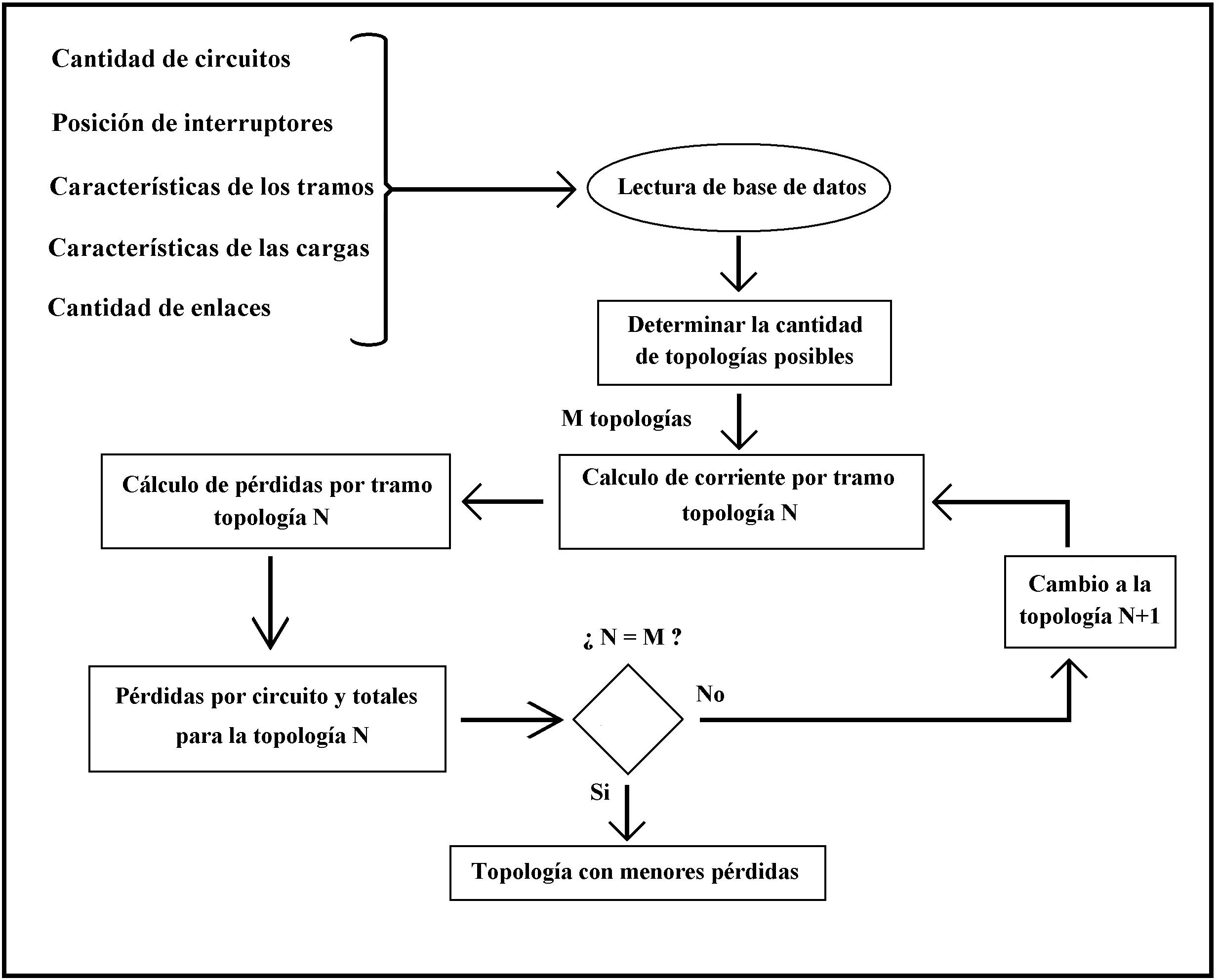 Posteriormente se desarrolló un programa en MATLAB que determina las pérdidas de energía en los circuitos de media tensión y las posibles combinaciones que un sistema tiene para intercambiar secciones mediante el cierre y apertura de interruptores y cuchillas, calculando las pérdidas para cada configuración y determinando así la topología con las menores pérdidas de energía.