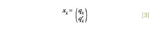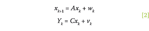 Esta ecuación se puede convertir a una formulación de primer orden en tiempo discreto con un periodo de muestreo ∆t, en la cual se asume que la excitación del sistema es ruido blanco. Esto se conoce como el modelo de espacio de estados estocástico en tiempo discreto,