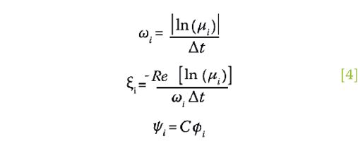 Los parámetros modales del sistema dinámico se pueden extraer de la matriz A por medio de sus autovalores μi y sus autovectores φi. Las frecuencias naturales ωi, las fracciones de amortiguamiento ξi y las formas modales observables ψi están dados por,