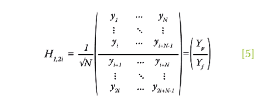 Por lo tanto, para identificar estas propiedades dinámicas únicamente se necesita identificar las matrices A y C; en esto se fundamenta el método SSI – COV. El primer paso es crear una matriz de Hankel H1,2i R (2i) l x N que incluye los vectores de medición yk de la siguiente manera,