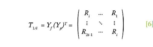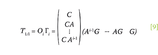 Con base en esta propiedad, se puede factorizar la matriz de Toeplitz en la matriz de observabilidad extendida Oi R lix2n y la matriz estocástica de controlabilidad extendida invertida Γi