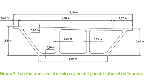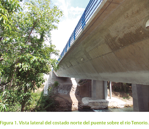 El puente sobre el río Tenorio (Figura 1) se ubica en la Carretera Interamericana Norte, Ruta Nacional No.1. Esta obra fue construida en el año 2014 como parte de la ampliación y rehabilitación de la carretera Cañas – Liberia, en la cual se contrató la construcción de 18 puentes nuevos y la rehabilitación de 18 puentes existentes. El puente posee una longitud entre centros de apoyos de 56,50 m y consta de un único tramo (Figura 2). La superestructura está formada por una viga cajón de concreto postensado de sección constante. La sección transversal de la viga cajón es asimétrica y posee un peralte variable entre 2,80 y 2,99 m; su tablero presenta un ancho de 12,10 m (Figura 3). Esta viga se encuentra simplemente apoyada en cada bastión por medio de cuatro apoyos expansivos de neopreno reforzado. Además, el puente cuenta con cinco diafragmas, dos en sus bastiones y tres diafragmas intermedios.