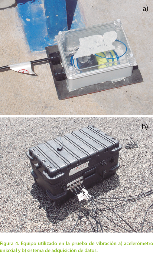 La prueba de vibración ambiental se realizó el 30 de setiembre de 2015. El equipo utilizado consistió en 31 acelerómetros uniaxiales piezoeléctricos modelo 393B04 de la marca PCB Piezotronics. Los acelerómetros fueron colocados dentro de cajas protectoras (Figura 4). Se utilizaron cuatro unidades de adquisición de datos modelo cRIO-9076 de la marca National Instruments, los cuales cuentan con sistemas de posicionamiento global (GPS) independientes para su correcta sincronización temporal. El sistema de monitoreo es híbrido; los acelerómetros se conectan por medio de cables a las unidades de adquisición de datos, y estas se conectan de manera inalámbrica al nodo usuario que finalmente recolecta los datos de la prueba. Este sistema de monitoreo registra las aceleraciones con una frecuencia de muestreo de 1652 Hz. El sistema mencionado ha sido validado en pruebas de laboratorio y pruebas de campo por los investigadores de la Unidad de Puentes del LanammeUCR (Liu, Agüero, Barrantes & Loría, 2015a; 2015b; 2015c).
