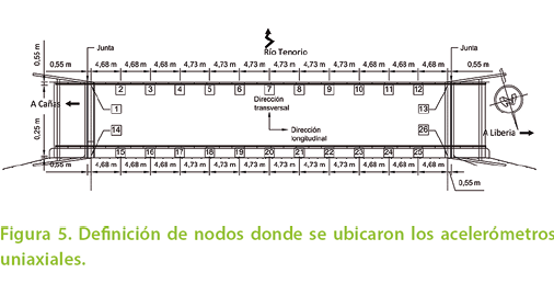 Se midió la respuesta dinámica del puente sobre el río Tenorio en condición operacional por medio del uso de 31 acelerómetros uniaxiales. En total se registraron aproximadamente 40 minutos de datos, agrupados en ocho series de datos de cinco minutos cada una. Se midieron las aceleraciones en 25 puntos distintos de la estructura. En todos se midió la aceleración vertical, y en cinco de ellos se registró la aceleración transversal y longitudinal. Es importante destacar que no fue necesario interrumpir el tráfico vehicular en ningún momento para realizar la prueba de vibración ambiental.