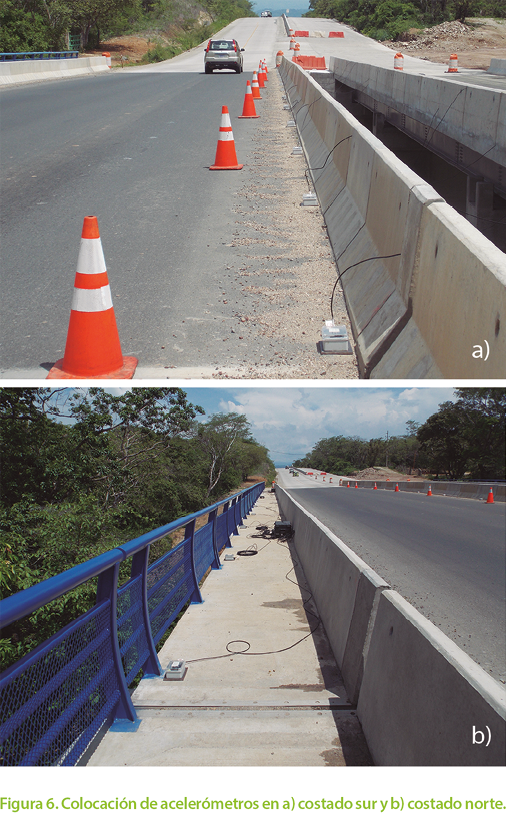 Durante la prueba de campo, los acelerómetros se ubicaron según las configuraciones que se explicaron anteriormente; estos se colocaron directamente sobre el tablero del puente, sin ningún medio de sujeción mecánica En el costado sur, los sensores se colocaron en el espaldón de la vía (Figura 6). Las unidades de adquisición de datos se colocaron en el puente paralelo, el cual se encontraba cerrado al paso vehicular puesto que estaba siendo rehabilitado. Debido a que el puente se mantuvo abierto al tránsito durante toda la prueba, se delimitó el espaldón del costado sur del puente con conos para garantizar la seguridad de las personas que participaron en la prueba y del equipo de medición. En el costado norte de la estructura tanto los acelerómetros como las unidades de adquisición de datos respectivas se colocaron en la acera del puente (Figura 6).