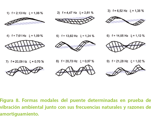 En este caso se identificaron modos con frecuencias de hasta 22 Hz. Con esto se demuestra que este tipo de evaluaciones no se limita a puentes de grandes claros con frecuencias naturales bajas. El método aplicado también es útil para puentes cortos que presentan frecuencias naturales altas por su elevada rigidez.