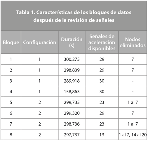 Seguidamente se llevó a cabo una revisión cualitativa de las señales para asegurar que los datos adquiridos no presentaran errores. Se suprimió la señal de aceleración del nodo 7 de los bloques de datos 1, 2, 5, 6, 7 y 8 debido a que presentaba picos de ruido de gran magnitud. Adicionalmente, se llevó a cabo un análisis preliminar de los datos usando el método SSI – COV a partir del cual se identificó que dos unidades de adquisición de datos empezaron a adquirir datos con un leve retraso en algunos bloques. Debido a que el método requiere una sincronización temporal de gran exactitud, se descartaron las señales de los sensores conectados a estas unidades de adquisición de datos. Estos problemas pueden ser ocasionados por las altas temperaturas presentes durante la prueba de vibración. La temperatura ambiental promedio fue de 45,4 °C y la temperatura promedio sobre la calzada fue de 54,1 °C; estos valores se acercan al límite superior de temperatura de operación de los controladores cRIO-9076 (55°C). En la Tabla 1 se presentan las características finales de los bloques de datos utilizados en el análisis.