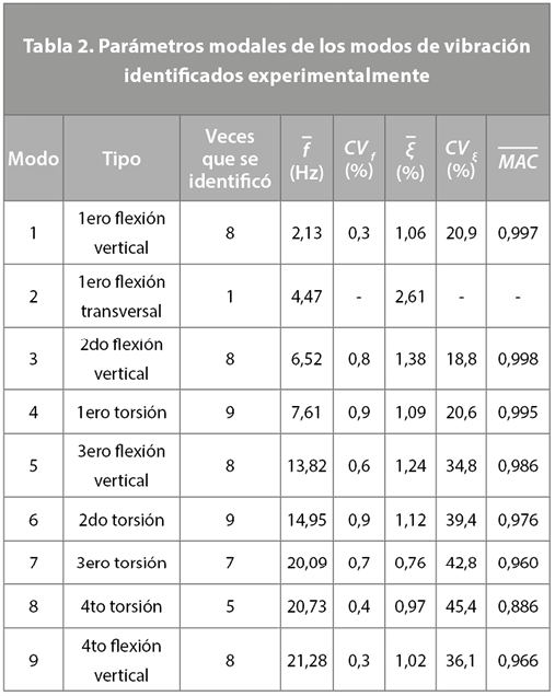 En la Tabla 2 se puede apreciar que la variabilidad de las frecuencias es sumamente baja. De igual forma, las formas modales son bastante estables con valores MAC elevados en todos los casos; solo el cuarto modo de torsión presentó un MAC promedio inferior a 0,90 al comparar los resultados de los distintos bloques de datos. Por lo tanto, se tiene certeza en torno a la estimación de estos parámetros. En cambio, la variabilidad asociada a las razones de amortiguamiento es muy elevada. Esto es una situación común para el caso de pruebas de vibración ambiental (Magalhães, 2010).