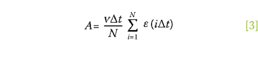 En esta ecuación, ∆t es el tamaño del intervalo de medición y N es la cantidad de puntos medidos por el sensor durante el tránsito del camión. El valor de A es proporcional a V y ε, siendo la deformación unitaria a su vez proporcional a P y a la rigidez de la viga a través de la ecuación [2]. Entonces, la ecuación [3] permite calcular el peso ya que el área de influencia incluye a todos los ejes del vehículo. Ahora bien, en condiciones reales la aproximación de la viga simplemente apoyada es insuficiente para modelar la verdadera rigidez del puente. Como alternativa al cálculo analítico de dicha rigidez, se puede medir experimentalmente el área de influencia de un vehículo conocido y así estimar el peso de otros vehículos por medio de la constante de calibración β, expresada como