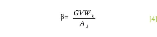 en donde GVWk es el peso bruto de un vehículo con características conocidas y Ak es el área de influencia experimental de ese vehículo. Una vez obtenido β , el peso de un vehículo desconocido GVWu es