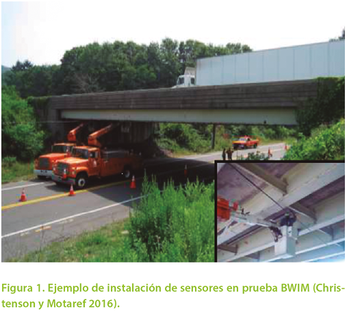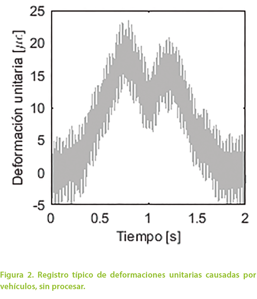 La Figura 1 muestra la instalación de sensores para la utilización de este método en un puente localizado en Connecticut, Estados Unidos (Christenson y Motaref, 2016). Cuando un vehículo pesado cruza el puente, los sensores producen registros similares al de la Figura 2. Si se hace transitar un camión con características conocidas sobre el puente, es posible asociar el registro de deformaciones unitarias que produce con sus propiedades y así, mediante relaciones de proporcionalidad, identificar las características de vehículos desconocidos.