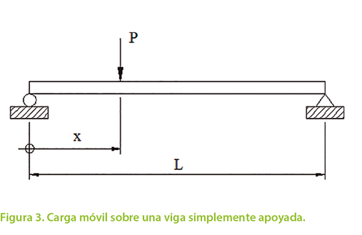 Las técnicas BWIM suelen aplicarse en puentes simplemente apoyados, como el de la Figura 1, porque facilitan la interpretación de los resultados. En este método, dichos puentes se pueden modelar inicialmente como vigas simplemente apoyadas, en donde el eje de un camión es representado como una carga puntual móvil P que está una distancia x desde uno de sus extremos, como se muestra en la Figura 3. A pesar de que el tránsito de una carga en estas condiciones es un fenómeno dinámico, las características de los puentes típicamente utilizados para este método y la velocidad a la que transitan los vehículos permiten asumir que no hay amplificación de la respuesta y por lo tanto se aproxima al caso estático.