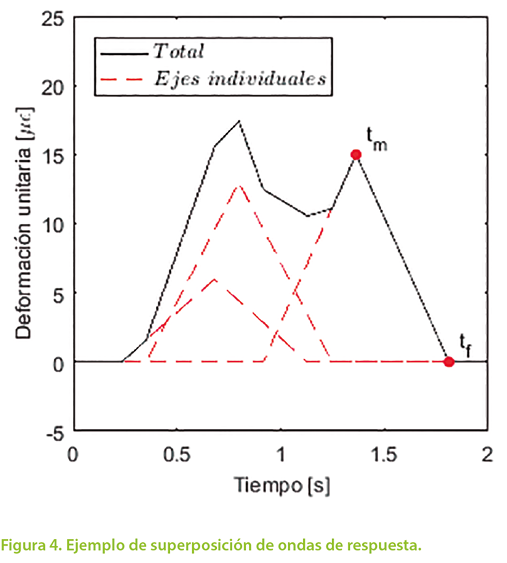 en donde ε es la deformación unitaria en la fibra inferior de la viga, c es la distancia desde el eje neutro hasta la fibra extrema en tensión, E es el módulo de elasticidad e I es el segundo momento de área de la sección transversal de la viga. La ecuación [2] define la variación de ε con respecto al tiempo t y se conoce como onda de respuesta (Ojio y Yamada, 2002). En esta expresión, ε es proporcional a P pero no puede utilizarse para el pesaje porque en un instante determinado, la deformación unitaria total es la suma de las que son causadas individualmente por cada eje, como se muestra en el ejemplo de la Figura 4.