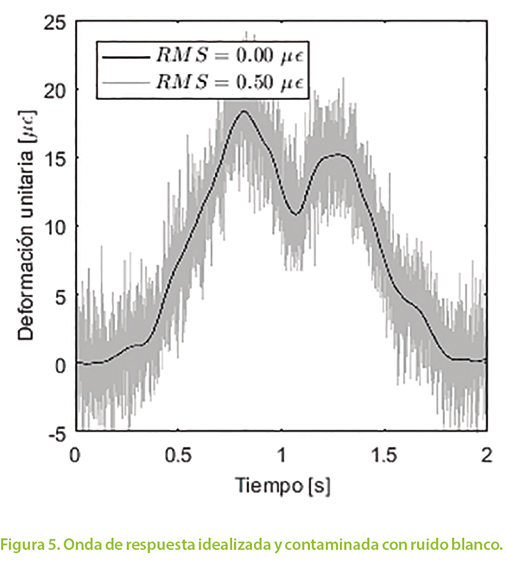 en donde RMS es el valor cuadrático medio de la señal (Root Mean Square) y B es el tamaño del ancho de banda en Hertz (en este caso, 100 Hz). Al definir el ruido de esta forma, se manipuló el valor RMS para generar en MATLAB registros sintéticos que luego se añadieron a la señal teórica, para así representar las condiciones experimentales reales. Por ejemplo, en la Figura 5 se muestra la señal contaminada con ruido con un valor RMS=0.50 με. Puede observarse que el ruido de la onda de respuesta ruidosa presentada en la Figura 5, es similar al ruido real mostrado en la Figura 2. Las diferencias entre ambos gráficos se dan porque el ruido sintético tiene densidad espectral constante en el rango de interés, mientras que el ruido real tiene un espectro no uniforme.