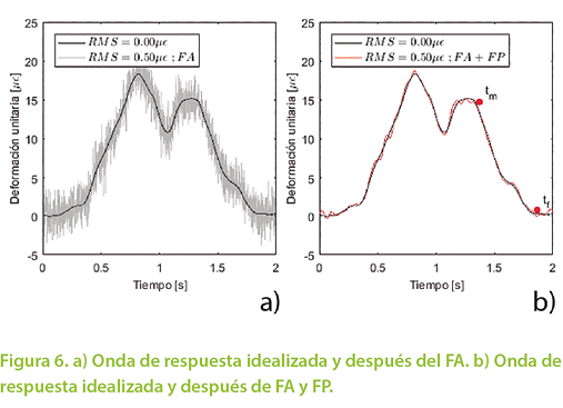 Ahora bien, el método BWIM estudiado requiere post-procesamiento adicional para calcular la velocidad y el peso, lo que implica que la señal debe ser filtrada nuevamente. En este trabajo, se utilizó un FP que también es tipo Butterworth de orden ocho, pero con una frecuencia de corte de 15 Hz. El resultado de aplicar este proceso en MATLAB se ejemplifica en la Figura 6b), en donde se observa la diferencia entre la señal ideal y la señal ruidosa obtenida después de aplicar ambos filtros. Cabe destacar que la aplicación de ambos filtros genera un retardo aparente en la señal filtrada como consecuencia de la convolución de la señal ruidosa con la función de respuesta de impulso de los filtros. Este es un efecto típico de los filtros causales en donde se genera una distorsión en la fase. En la Figura 6b) se muestran ambas señales superpuestas para efectos de comparación únicamente.