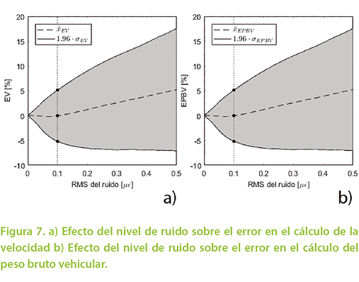 Similarmente, la Figura 7b) muestra los resultados obtenidos para el error en el cálculo del peso bruto vehicular (EPBV). Como puede observarse, el gráfico es virtualmente idéntico al caso de la velocidad. Esto es consecuencia de que el área de la onda de respuesta casi no varía porque los filtros eliminan las componentes de la señal de mayor frecuencia. La poca diferencia entre ambos gráficos indica entonces que el método es altamente sensible al cálculo de la velocidad. Por lo tanto, los esfuerzos para mejorar la confiabilidad del método deben enfocarse en un cálculo más preciso de