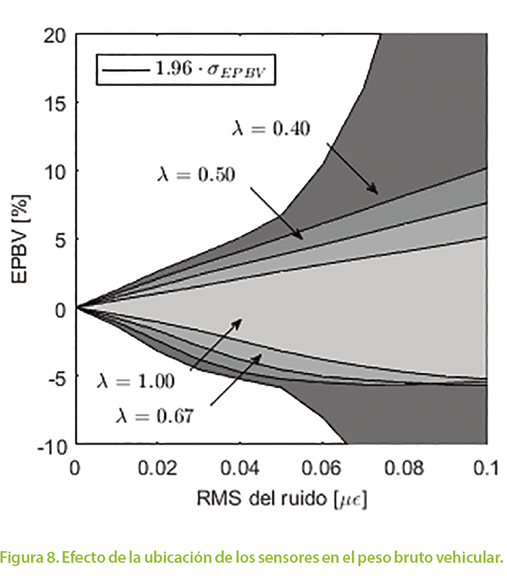 Asumiendo que la ubicación ideal está en el punto medio del puente y en la fibra inferior de una viga, se calculó la variación del error con respecto a la intensidad de ruido para distintos valores de λ, en forma análoga al efecto estudiado en la sección anterior, pero en el rango de RMS=0.00 με a RMS=0.10 με. Los resultados se muestran en la Figura 8, para el caso del peso bruto vehicular. El gráfico para el caso de la velocidad se omite dado que, como se mostró anteriormente, no existen diferencias significativas con respecto al peso. En esta figura, el error cuando el valor RMS=0.10 με y λ=1.00 es consistente con los resultados mostrados en la Figura 7b). Las áreas sombreadas están limitadas por sus respectivos valores extremos. Se observa que para factores λ mayores a 0.50, los errores son menores que 10%, siempre y cuando el valor se mantenga por debajo de RMS=0.10 με. No obstante, en lugares más alejados de la posición ideal, los errores crecen desproporcionadamente y por lo tanto no es aconsejable realizar las mediciones en dichas circunstancias. Entonces, estos resultados apuntan a que los cálculos son confiables siempre y cuando el factor se está por encima de λ=0.50.