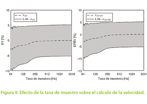 Los resultados obtenidos se muestran en las Figuras 9a) y 9b), en donde el eje horizontal está en escala logarítmica de base 2. En estos dos gráficos el error para la tasa de muestreo inicial de 2048 Hz, también es consistente con los errores obtenidos para RMS=0.10 με en las Figuras 7a) y 7b). Al disminuir la tasa de muestreo se observa un aumento del error en los cálculos, lo cual es de esperar dado que la resolución de la onda es menor. Nuevamente, los resultados para la velocidad y peso son prácticamente los mismos, lo cual refuerza el hecho de que la velocidad es el factor dominante en este método. Para tasas de muestreo tan bajas como 256 Hz, se obtienen prácticamente los mismos resultados que para la tasa original. Aún más, para tasas de muestreo de 64 Hz, los errores se mantienen dentro de la tolerancia indicada por la norma ASTM. El aumento en el error en el rango de frecuencias más bajas se explica por el hecho de que los filtros son incapaces de corregir las interferencias y el error empieza a crecer desmedidamente. Los resultados que muestran estas dos figuras indican que existe el potencial de aumentar la eficiencia de la recolección de los datos obtenidos con esta metodología, ya que se puede disminuir dramáticamente el espacio requerido para almacenarlos y la velocidad con la cual se procesan los resultados.