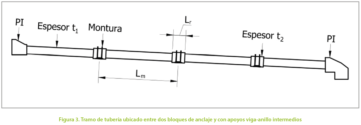 La metodología de diseño automatizada es la que se indica principalmente en Manuals and reports on engineering practice No. 79: steel penstocks (ASCE, 2012). Se parte de una tubería de presión sin juntas de expansión de acero, donde se quiere estudiar el comportamiento de un tramo de tubería comprendido entre dos cambios de dirección idealizados como apoyos tipo empotramiento, llamados PI en la Figura 3. El tramo de tubo se idealiza como una viga continua con apoyos simples ubicados en cada montura formada por una viga-anillo. La pieza de tubo con longitud Lr (ver Figura 3) se ve afectada por la restricción a deformarse libremente producida la viga-anillo cuando la tubería se somete a presión.