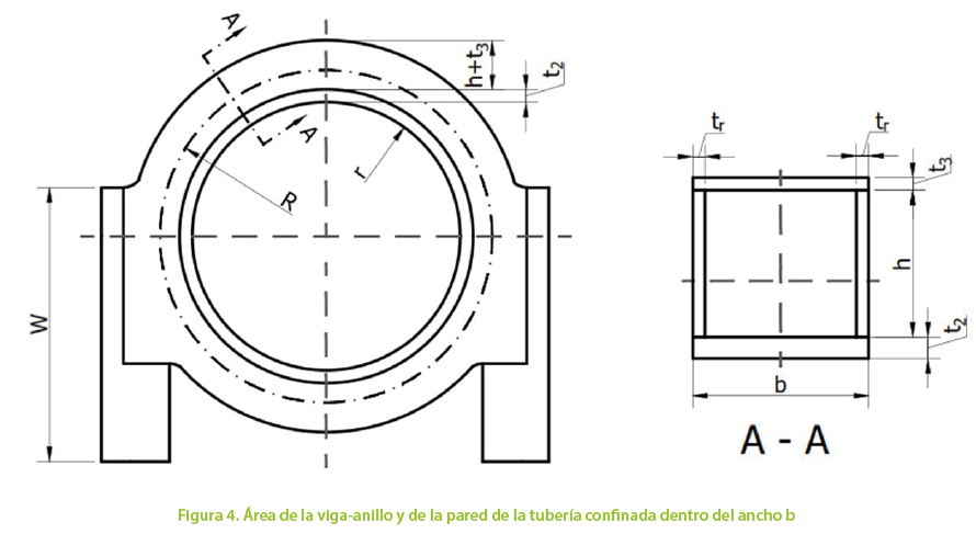σLRN es el esfuerzo longitudinal local que se produce por la restricción que le ocasiona la viga-anillo a la expansión radial de la tubería (kg/cm2), Ar es el área de la sección transversal de la viga-anillo que contempla también el área de la pared de la tubería que se encuentra confinada por el ancho b (cm2), tal como se aprecia en la Figura 4.