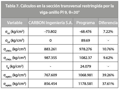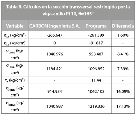Se encontraron varias diferencias en la comparación de resultados con la memoria de cálculo de CARBON Ingeniería S.A.. Estas se dan porque el programa elaborado realiza un análisis más exhaustivo de los esfuerzos. En el caso del esfuerzo por efecto de la gravedad, σLG, las diferencias se presentan porque el programa considera en su código la posibilidad de que existan cambios de espesor en los tramos y calcula el esfuerzo de manera más precisa. Con respecto al esfuerzo por el efecto de viga, σLB, las diferencias ocurren porque el programa calcula ese esfuerzo para cada 15° de la circunferencia de la tubería, en cambio en la memoria de CARBON Ingeniería se calculan para las fibras extremas (0° y 180°, exclusivamente). Las diferencias anteriores se arrastran a los esfuerzos longitudinales totales σLTN1c y σLTN2c. Adicionalmente, con esta herramienta se pueden calcular los esfuerzos debido al cortante de viga, τB, los cuales fueron despreciados en la memoria de cálculo de CARBON Ingeniería S.A. por su poca magnitud. Por otro lado, los esfuerzos equivalentes σeqN1c y σeqN2c fueron los que exhibieron mayores diferencias, ya que la metodología contemplada por el programa sigue las recomendaciones del ASCE en cuanto a ajustar las solicitaciones con la eficiencia de junta antes de combinar los esfuerzos y además, se toma en cuenta el esfuerzo cortante de viga en la ecuación de la energía de máxima distorsión.