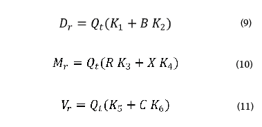 El momento interno, Mr (kg*cm), la fuerza axial, Dr (kg), y la fuerza cortante radial, Vr (kg), se calculan así: