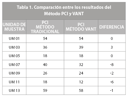 La Tabla 1, muestra la comparación entre los resultados obtenidos entre el Método tradicional PCI y el Método VANT. Cabe resaltar que en el método empleando imágenes del VANT se levantaron las fallas de las 13 unidades de muestra.