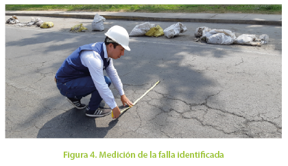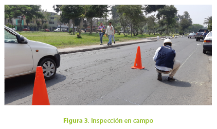 El relevamiento de las fallas se realizó empleando hojas de inspección y catálogo de fallas de referencia. Asimismo, se empleó el equipo de protección personal adecuado y fue necesario cerrar parcialmente la vía utilizando conos de seguridad debido al tránsito de vehículos como se aprecia en la Figura 3.