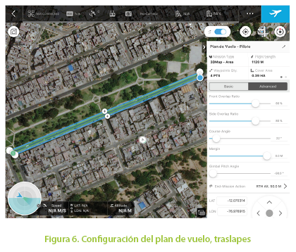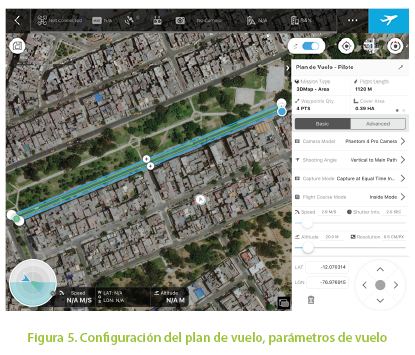 La misión o plan de vuelo se realiza mediante la aplicación DJI GS Pro, en la cual se delimita el área en estudio y se ingresa los parámetros de vuelo, para garantizar una resolución o GSD de 5 mm por pixel se programó la altura de vuelo a 20 m. Asimismo, se considerado recubrimientos longitudinales y transversales de 80% en ambos casos para obtener mayor número de puntos homólogos y una mejor correlación de los mismos. El programa calcula automáticamente con los parámetros ingresados las líneas de vuelo, número de imágenes proyectadas y tiempo de vuelo como se aprecia en la Figura 5 y 6.