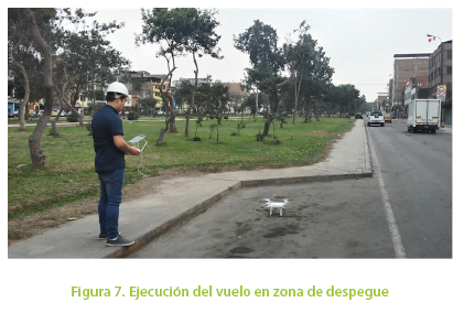 Para ejecutar el vuelo se escoge y delimita una zona de despegue dentro o fuera de la zona de estudio donde no exista obstáculo alguno para que el VANT pueda elevarse sin problemas como se muestra en la Figura 7. Para la realización del vuelo se realiza previamente un checklist que asegura la viabilidad del vuelo: