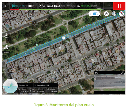 Una vez que el VANT despega, no es necesario el control manual alguno por parte del piloto, salvo se necesite cancelar el vuelo. Sin embargo, se puede monitorear en tiempo real la ubicación, velocidad, trayectoria, imagen de transmisión, número de satélites del GPS, cantidad de fotografías realizadas y porcentaje de la batería del equipo como se aprecia en la Figura 8.