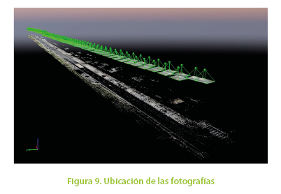 El procesamiento de las imágenes se realiza en gabinete mediante el software Pix4dMapper, se ingresan las imágenes obtenidas en el vuelo y se inicia el proceso fotogramétrico. Como primer paso el programa realiza el tratamiento inicial donde extrae automáticamente puntos clave de las imágenes para calcular la verdadera ubicación y los parámetros de cada imagen como se muestra en la Figura 9. Para el presente estudio se analizaron 145 imágenes con una resolución espacial de 5 mm por pixel.