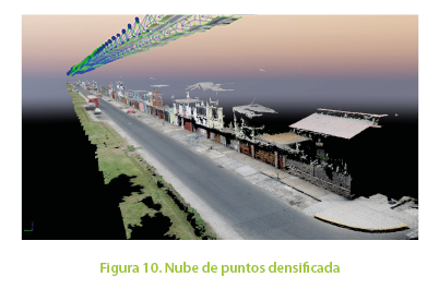 Luego densifica y filtra la nube de puntos de la zona de estudio para finalmente hacer la triangulación y obtener el modelo en 3D. Para nuestra vía en estudio se obtuvieron 29,708,344 puntos densificados como se muestra en la Figura 10 que dio como resultado el modelo 3D que se aprecia en la Figura 11.