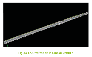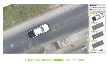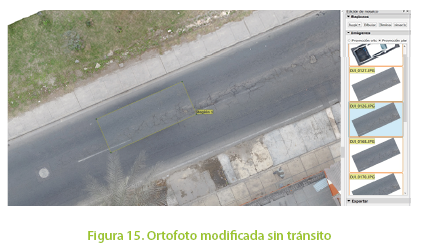 Es probable que en la ortofoto aparezcan vehículos o personas debido al usual tránsito en la vía, que nos impidan realizar la inspección en gabinete como se muestra en la Figura 14. Esto se debe a que en este método no es necesario cerrar parcial o totalmente la vía para ejecutar el vuelo. Sin embargo, el software permite realizar modificaciones ya que debido al recubrimiento longitudinal y transversal del vuelo cada región de la vía contiene más de una fotografía y, por tanto, la ortofoto es modificable fácilmente logrando una vía despejada como se observa en la Figura 15, para su posterior inspección.