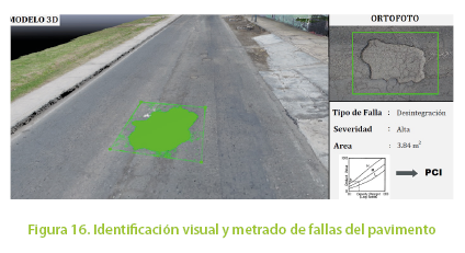 Con la ortofoto de gran resolución y el modelo en 3D se procede a realizar el inventario de fallas de las 13 unidades de muestra de manera visual, determinando la longitud o área según el tipo de falla y su grado de severidad como se muestra en la Figura 16. En el programa PIX4D Mapper o en CAD se puede terminar el ancho, longitud o área de cada deterioro.