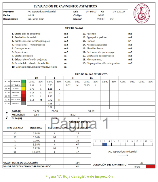 El tiempo total de procesamiento, edición de la ortofoto e identificación de las fallas fue de 4 horas y media, obteniendo hojas de inspección y planos detallados de todas las unidades de muestra.