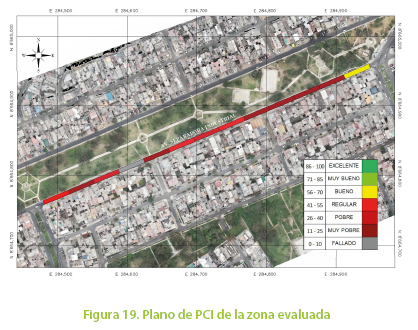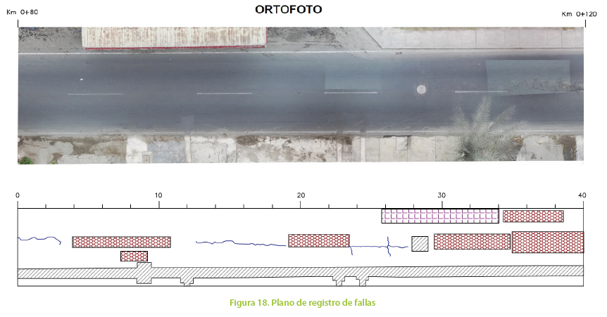 La ortofoto de la zona de estudio permite la elaboración de planos de fallas indicando el lugar de cada falla con sus respectivos metrados para su futura intervención. Esto permite ubicar cada tipo de falla en campo y tener un registro que da la posibilidad de evaluar como se atendió el problema.